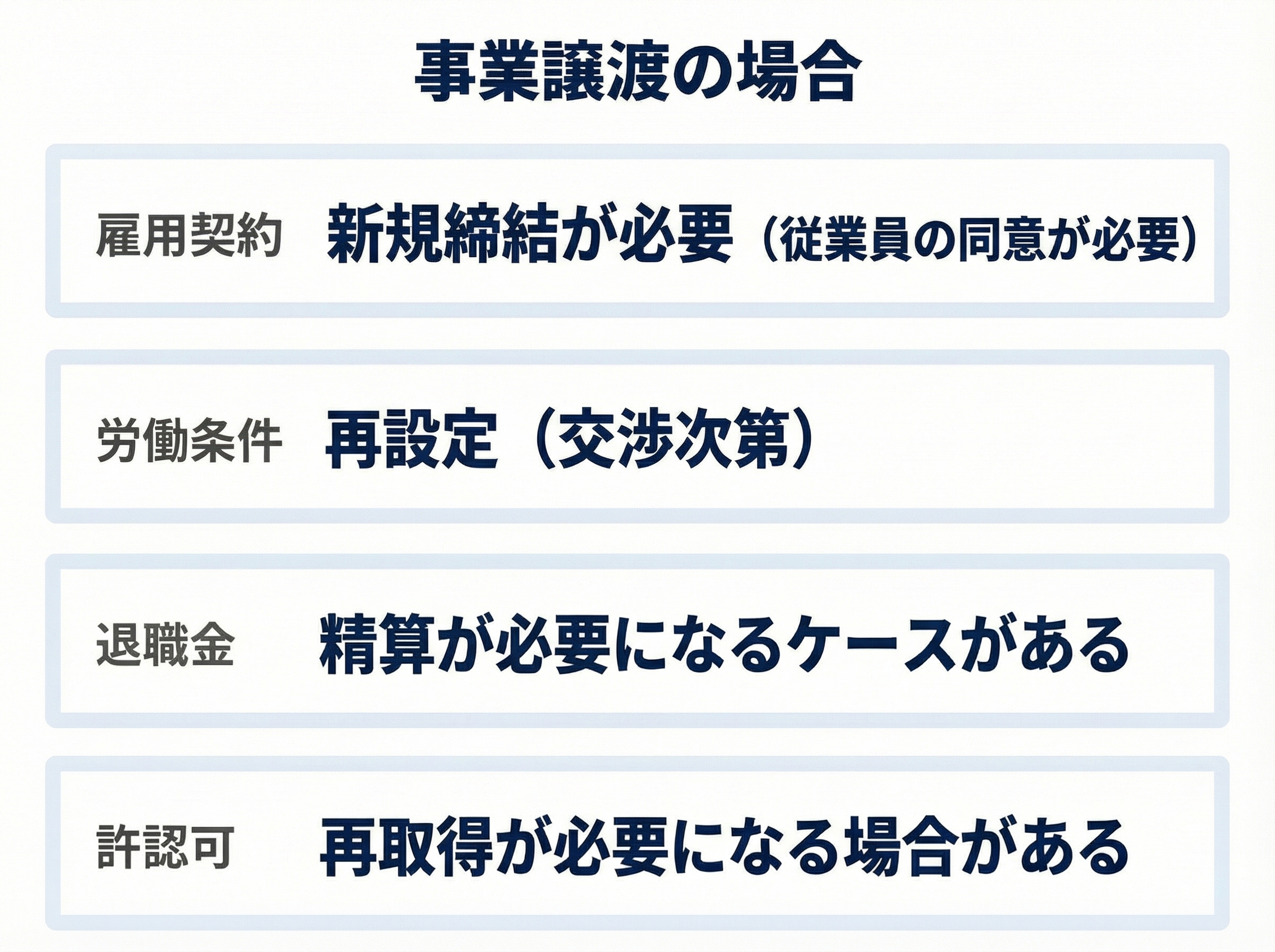 事業譲渡を選択する場合、従業員が新しい雇用条件に同意しなければ雇用関係が成立しないため、丁寧な説明と適切な条件提示が必要です。