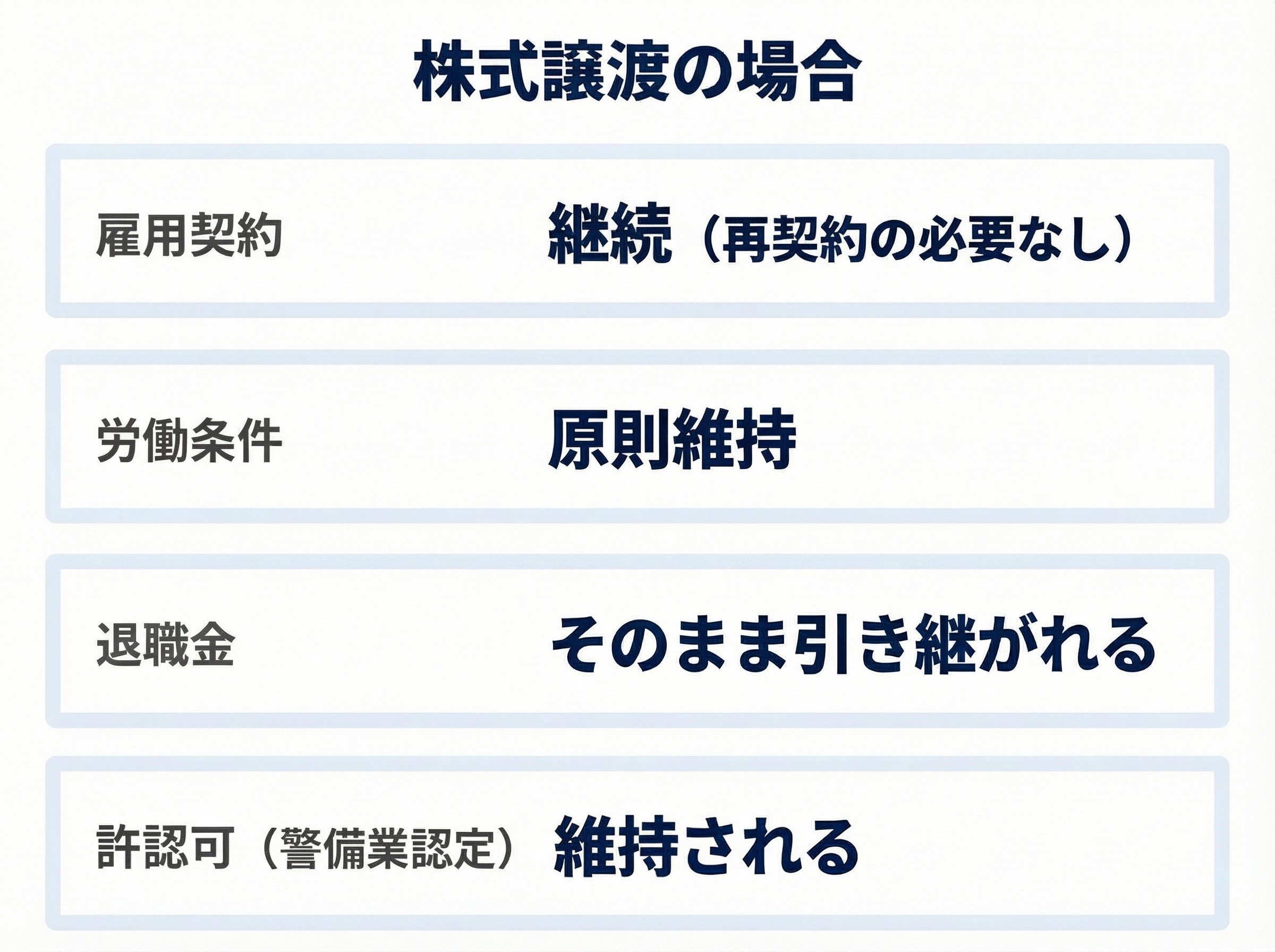 - 株式譲渡であれば、従業員の雇用契約はそのまま引き継がれ、労働条件も原則として維持される