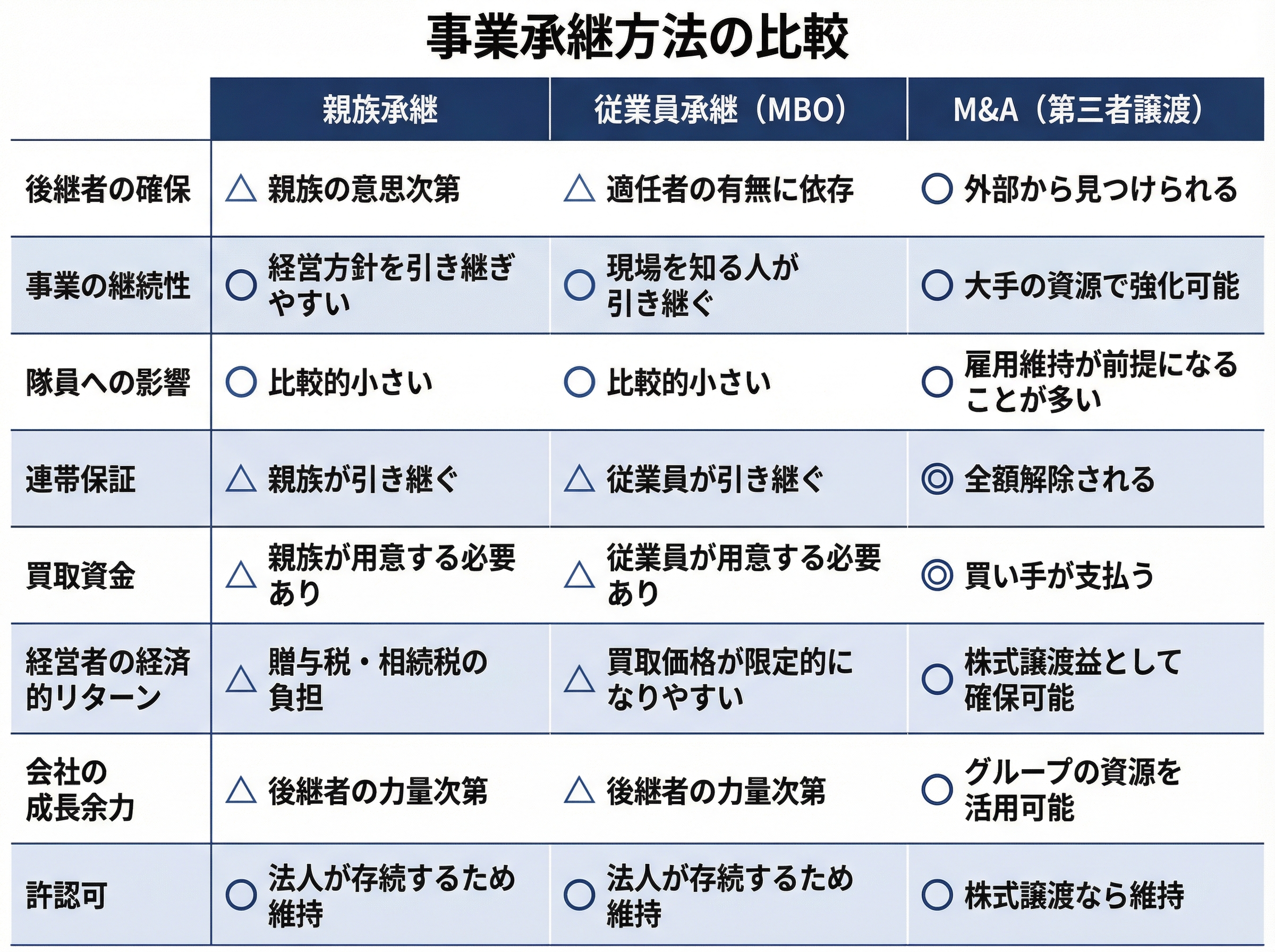 - 現場の事情をよく知る人物が経営を引き継ぐため、隊員や取引先への影響が小さい