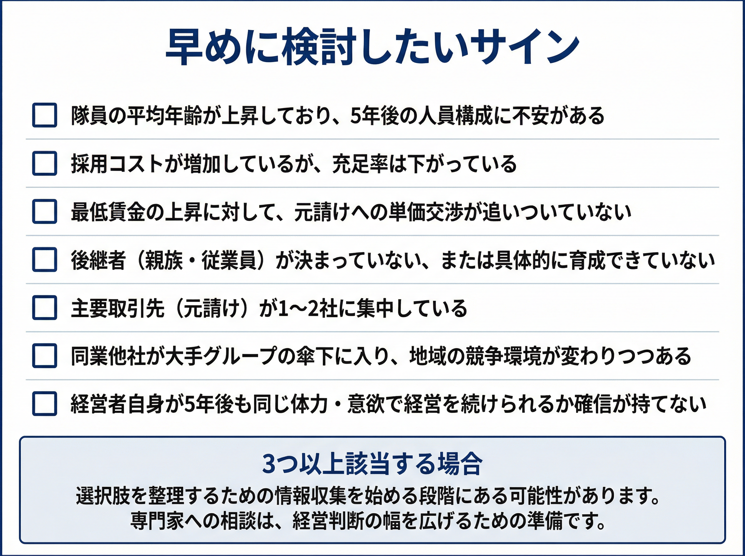 - このギャップは一時的なものではなく、人口動態や市場構造に根ざした不可逆的な変化である。経営に余裕があるうちに自社の状況を客観的に見つめ、選択肢を検討することが、従業員と取引先を守ることにつながる