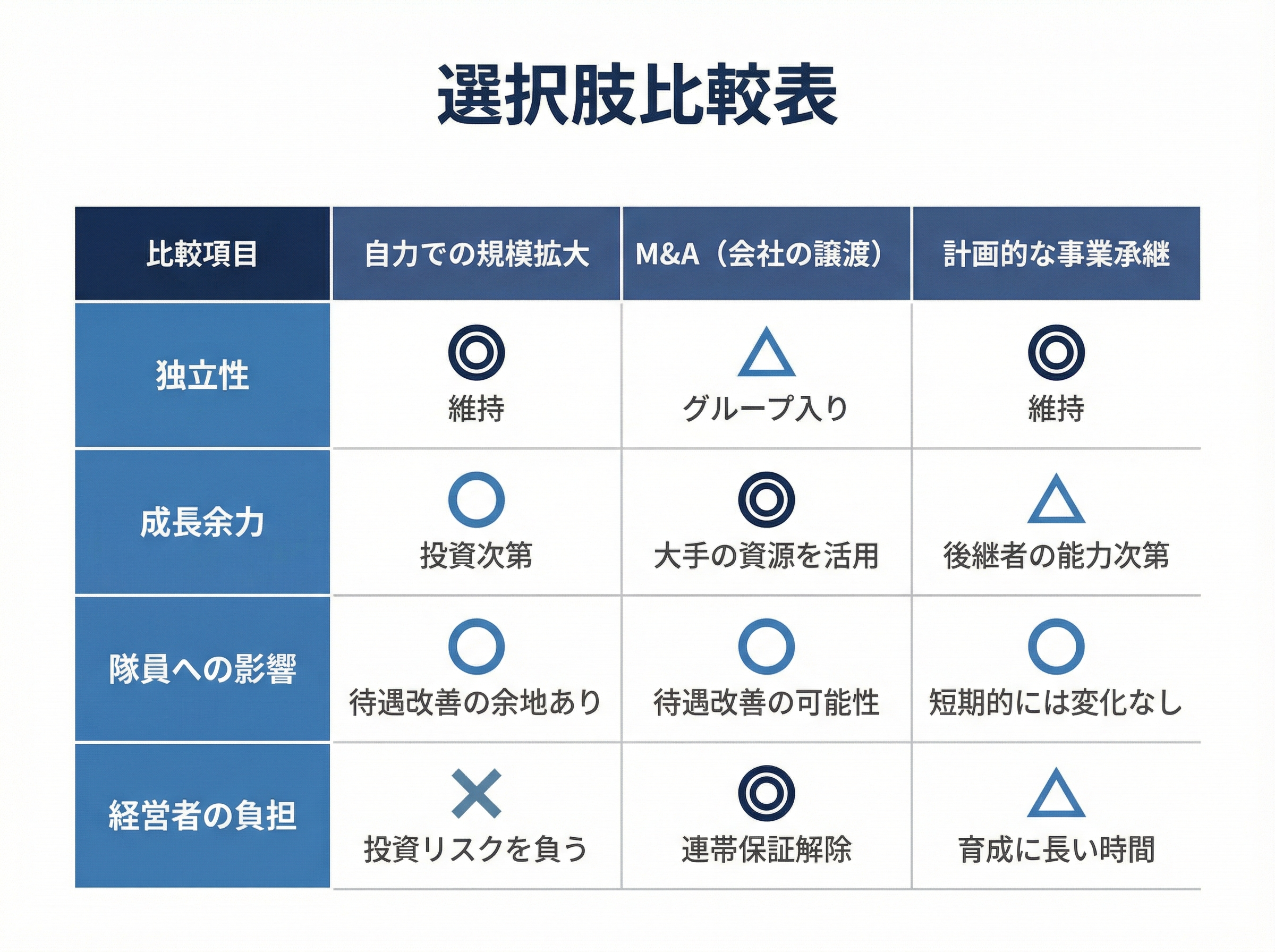 - 自力での規模拡大、資本提携・業務提携、M&A、計画的な事業承継の4つが主な選択肢です。自社の規模、財務状況、後継者の有無などを踏まえ、どの選択肢が現実的かを早めに整理しておくことが重要です。
