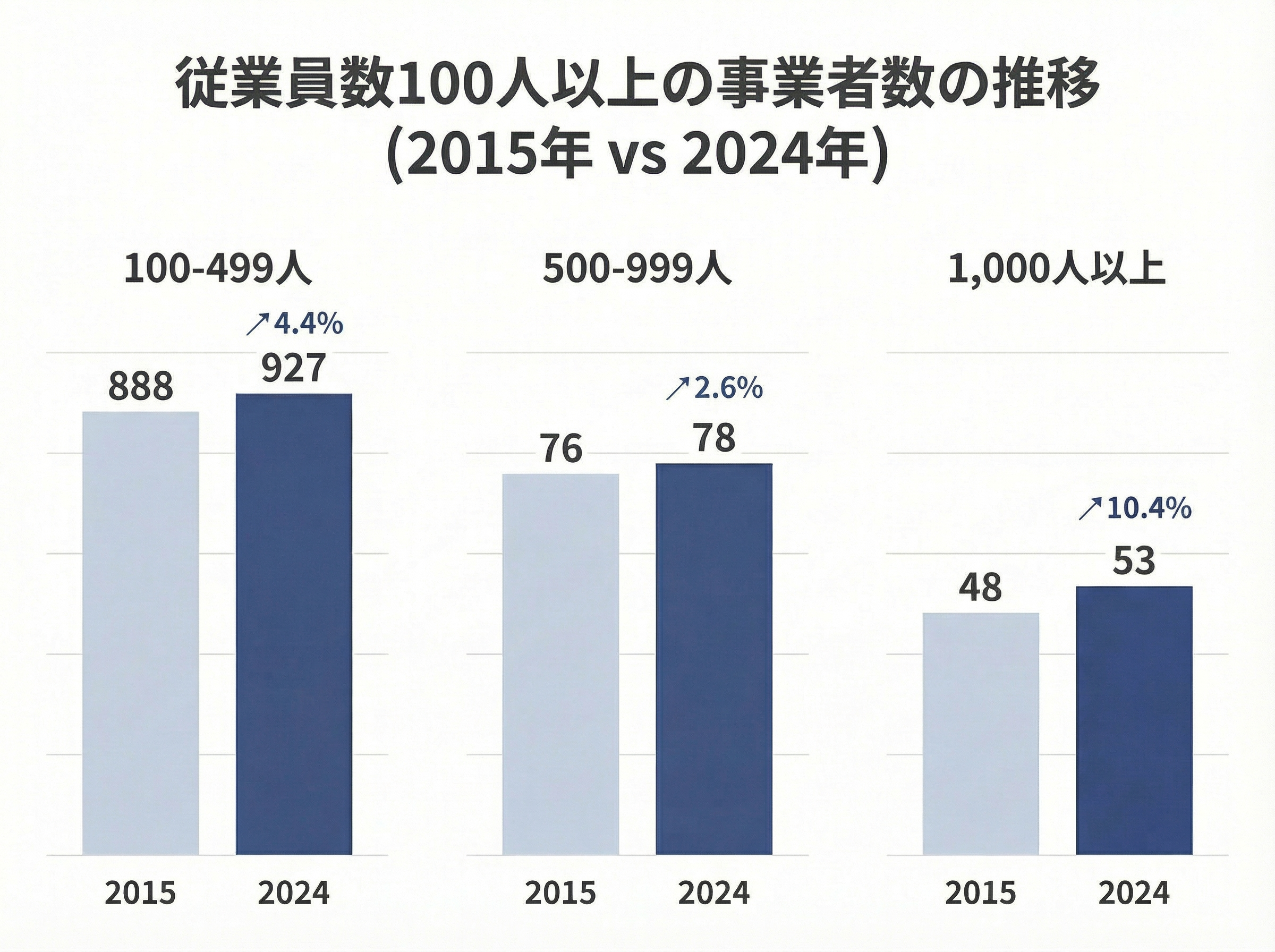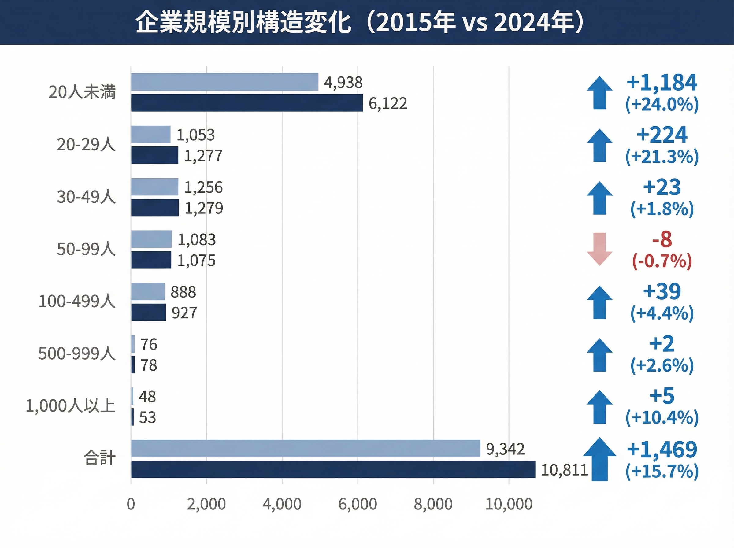注目すべきは、増加した1,469社のうち1,408社(95.8%)が従業員30人未満の小規模事業者であるという点です。20人未満の事業者だけで1,184社も増加しています。一方、30人以上の規模では、ほぼ横ばいか微増にとどまっています。