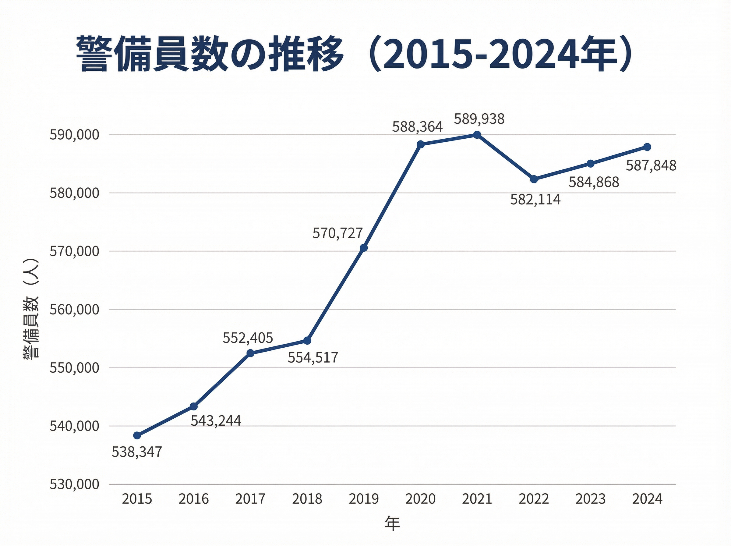 警察庁「警備業の概況」によると、警備員数は2015年(平成27年)末の538,347人から2024年(令和6年)末の587,848人へ、49,501人(9.2%)増加しています。