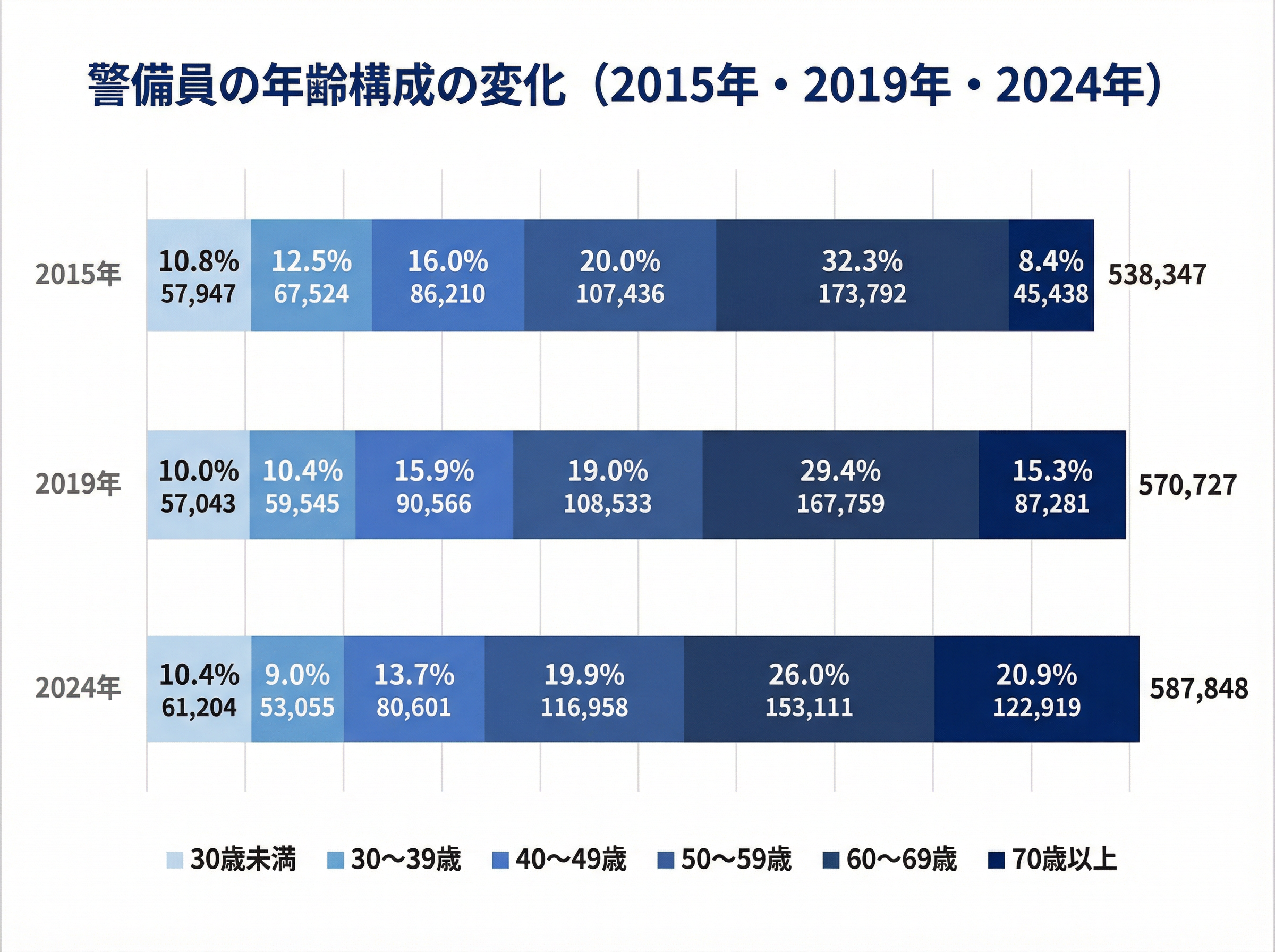 2024年末時点で、70歳以上の警備員は122,919人。2015年の45,438人から77,481人増え、構成比は8.4%から20.9%へと約2.5倍に拡大しました。いまや70歳以上は60代に次いで、全年齢層で2番目に多い区分です。60歳以上の合計は全体の46.9%を占め、警備員のほぼ半数が60歳以上という現状にあります。
