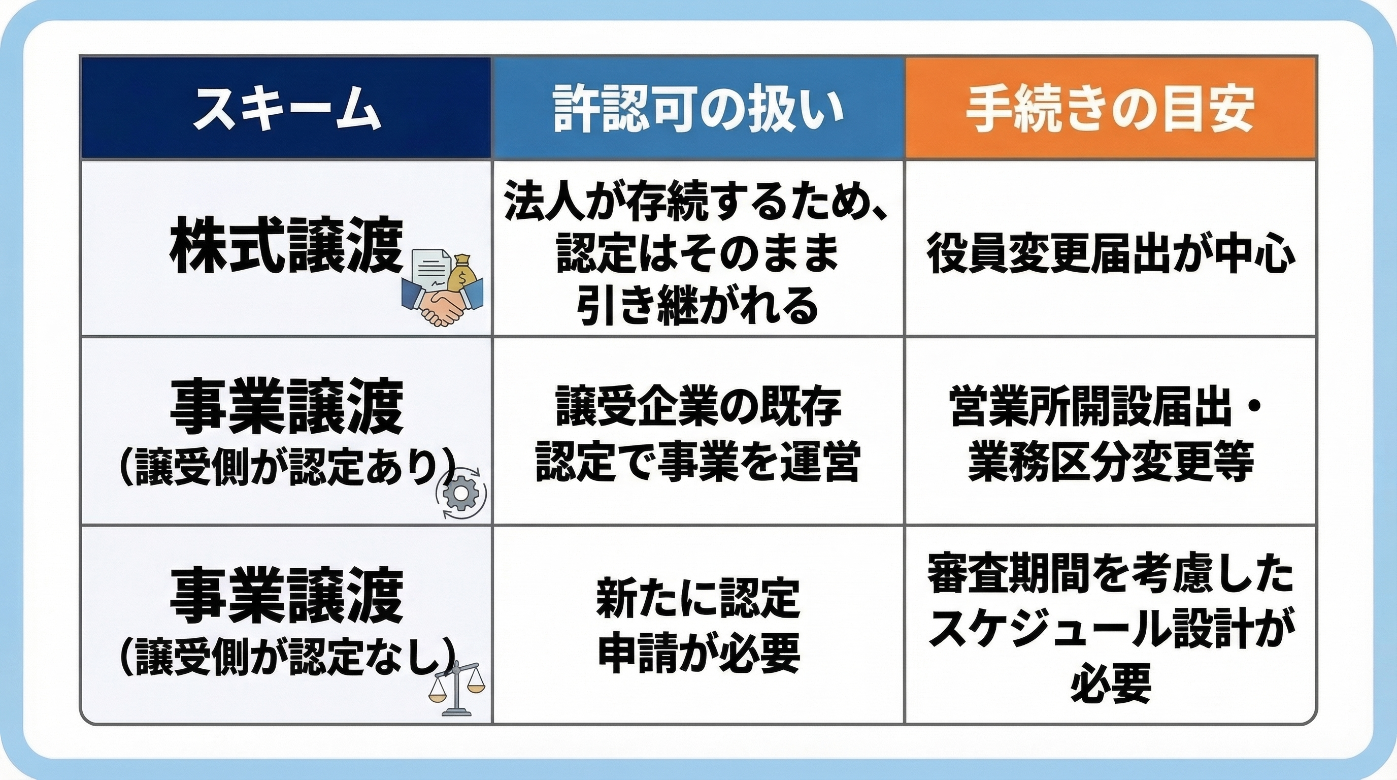 - 事業譲渡では、譲受企業が認定を保有していない場合は新規取得が必要となり、審査期間を踏まえたスケジュール設計が重要になる。