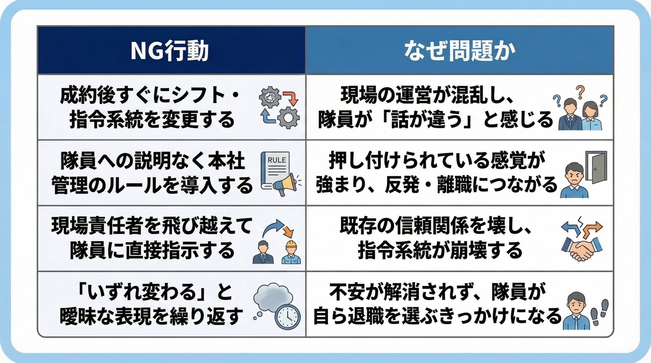 結論:以下の行動は隊員の不信感を招きやすく、離職の引き金になりうる。