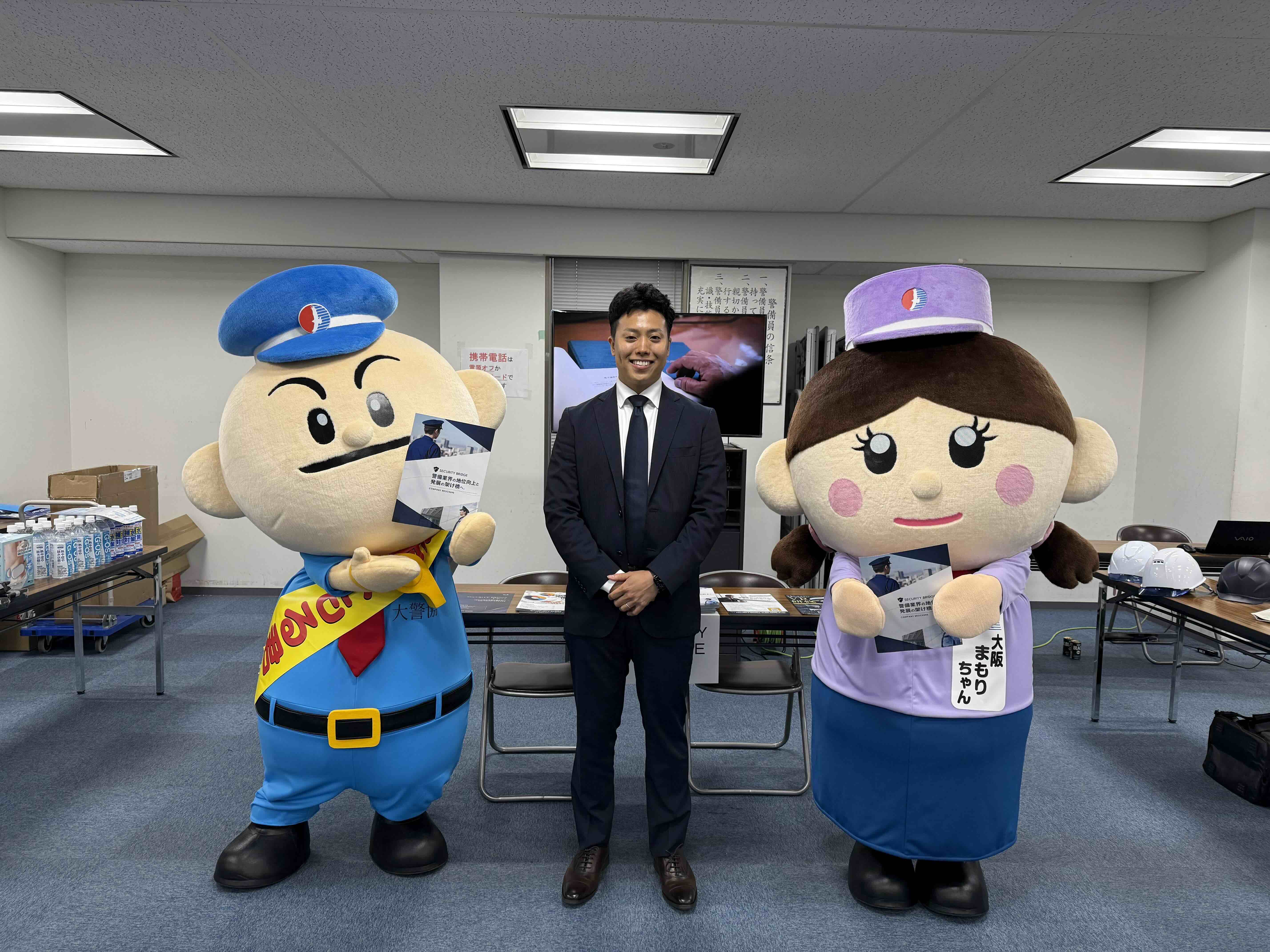 また、当日は大阪府警備業協会のキャラクター「大阪まもる君」と「大阪まもりちゃん」も来場され、弊社ブースにもお立ち寄りいただきました。記念撮影にも快く応じていただき、会場は終始和やかな雰囲気に包まれていました。